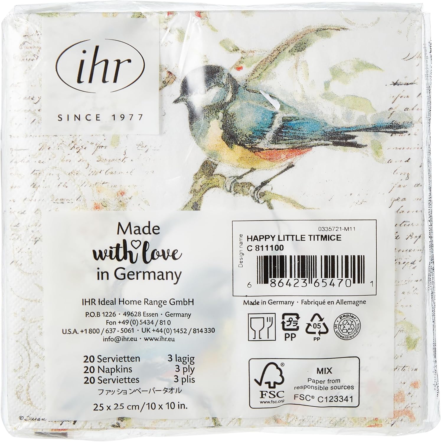 Delight guests with the Happy Little Titmice Cocktail Napkin, where painterly birds perch among delicate script to bring a note of woodland whimsy to the bar. Printed on soft, sturdy paper, these cocktail napkins neatly handle small pours and bites while layering your setting with artful charm. Approximate dimensions are 5 x 5 x 1 inches. German printed on soft, 3-ply paper.
