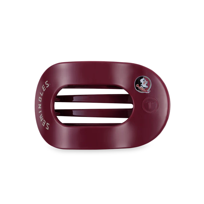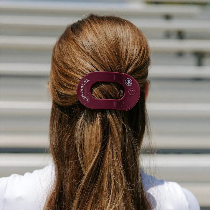 Lay flat and relax with the new TELETIES Go Noles! Medium Flat Round Hair Clip in Garnet and Gold. This hair clip is designed to allow you to lay back flat, do yoga, or sit comfortably in a seat with a headrest, and it is made with the same material that is nearly unbreakable. Shop your favorite Florida State University hair accessories now! Go Noles!