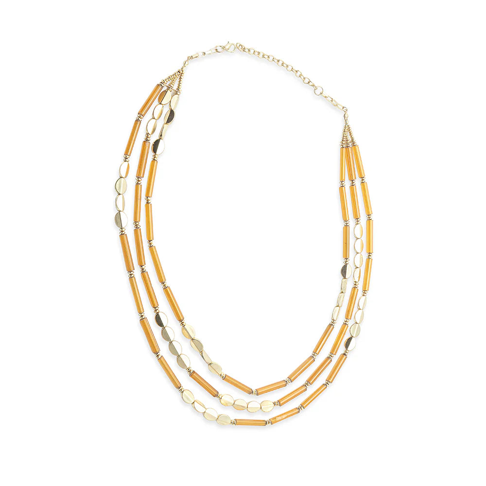 Embrace desert elegance with this three-strand masterpiece featuring amber-hued tubes and golden desert pebbles. Like sunlight cascading across mesa layers at dusk, this sophisticated piece captures the warm glow and natural geometry of the Southwest landscape in perfect harmony. Dress up or dress down with the gorgeous colors and form - sure to be a favorite in your collection!